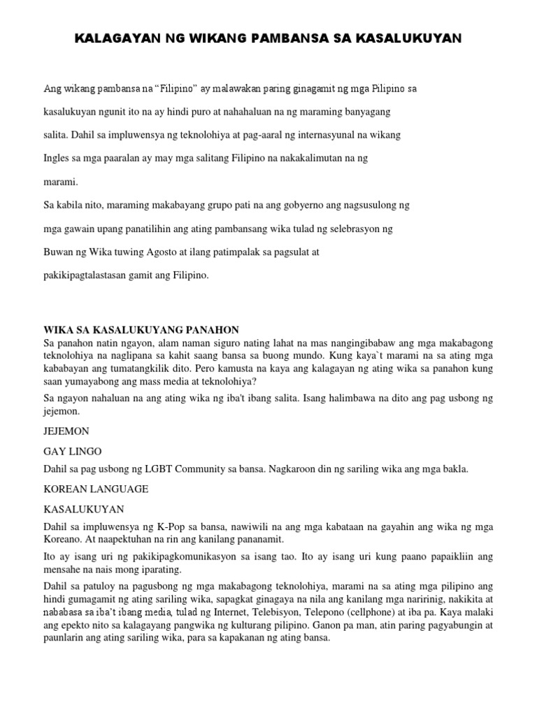 Kalagayan Ng Wikang Pambansa Sa Kasalukuyan Pdf