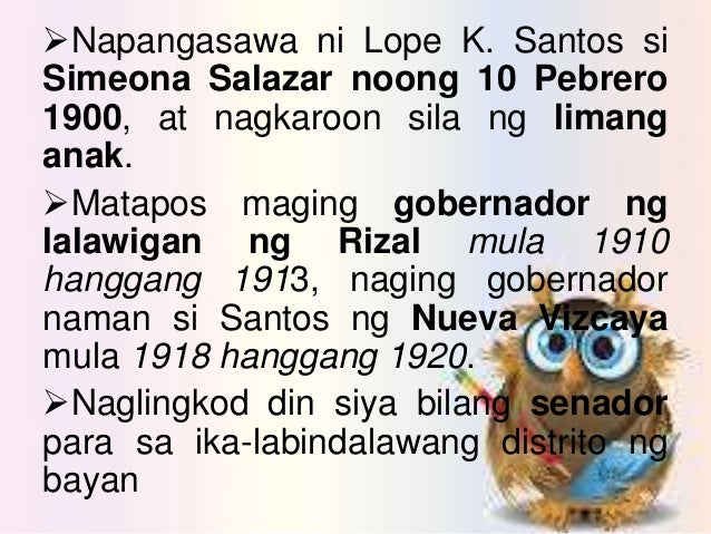 Santos born Lope Santos y Canseco September 25 1879 May 1 1963 was a Filipino Tagalog-language writer and former senator of the PhilippinesHe is best known for his 1906 socialist novel Banaag at Sikat and to his contributions for the development of Filipino grammar and Tagalog orthography. Santos JULIAN Cruz Balmaceda at Inigo Ed. Ayon naman kay senador Recto ito raw ay isa sa pinakamahusay na tulang tagalong sa paksang paggawa.