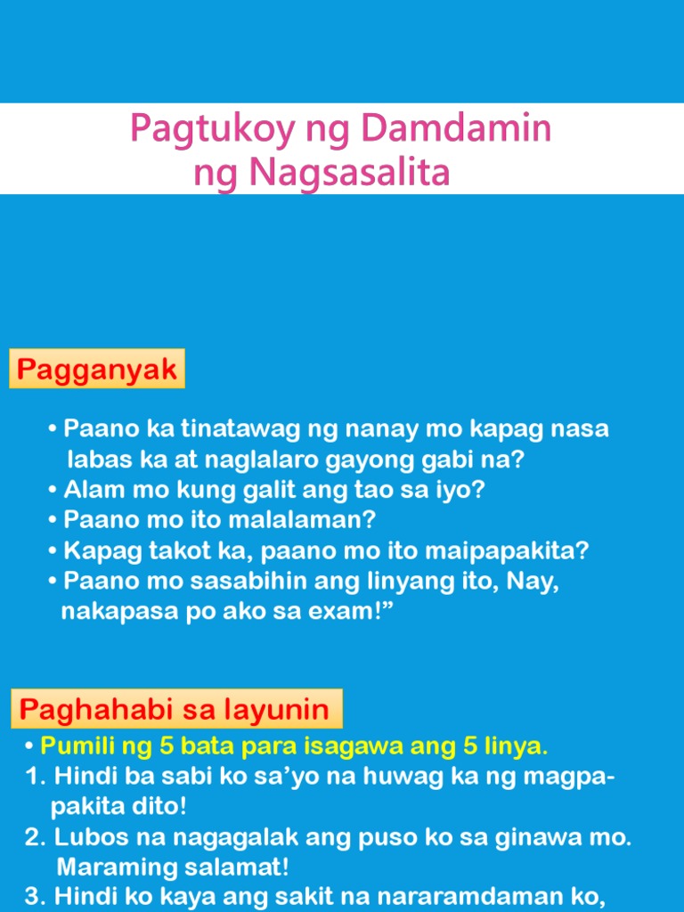 Pagtukoy sa Damdamin Pagtukoy sa Damdamin ng Tagapagsalita. Nagpapalinaw ito ng mensahe o intensyong nais ipabatid sa kausap tulad ng pag-awit. K to 12 Filipino Gabay Pangkurikulum Mayo 2016 Pahina 79 ng 190 Educational Projams K to 12 BASIC EDUCATION CURRICULUM Pakikinig Pagsasalita Pagbasa Pagsulat Pagpapahalaga sa Wika Literasi at PanitikanLINGGO Pag-unawa sa Napakinggan Wikang Binibigkas Gramatika Kayarian ng Wika Pag-unlad ng Talasalitaan Pag-unawa sa Binasa.