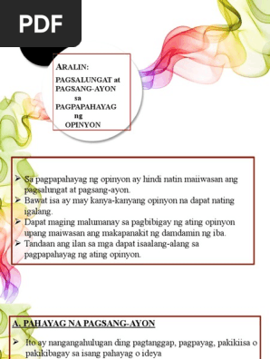 Ang pagsang-ayon ay nagpapakita ng iyong pagsuporta o pag-aproba sa sinasabi o pahayag ng isang tao habang ang pagsalungat ay pagpapakita ng iyong hindi pag-aproba o hindi pagsang-ayon sa sinasabi o pahayag ng isang tao. Mga Pahayag ng Pagsang - ayon at Pagsalungat Pangangatuwiran - ay isang pahayag na nagbibigay ng sapat na katibayan o patunay upang ang isang panukala ay maging katanggap- tanggap o kapani- paniwala 4. Ang pagpapalit-anyo nito at pagbibihis mula sa makalumang panitikan.