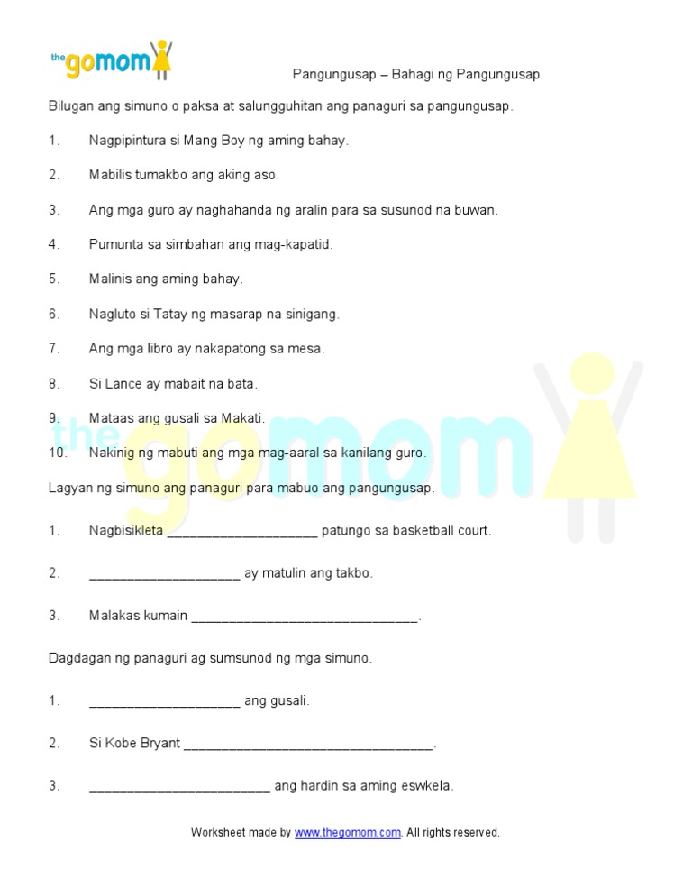 Mga uri ng pangungusap 1. Pangungusap Worksheets Part 5 The five pdf worksheets below are about the five types of Filipino sentences.