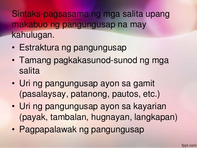 Tulad din ng sumusunod na mga salita na may iisang morpema lamang. Paturol-Ito ang mga pangungusap na nagpapahayag ng katotohanan kalagayan palagay o pangyayariGinagamitan ng bantas na tuldok. Hugnayan na pangungusap kayarian ng pangungusap payak na pangungusap payak tambalan hugnayan tambalan na pangungusap uri ng pangungusap ayon sa kayarian.