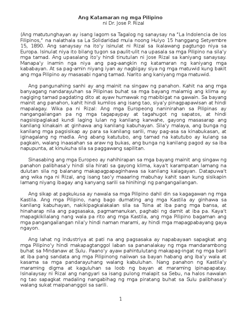 Ang ibig sabihin ng sanaysay na ito sa Ingles The Indolence of. Hindi naman tinutulan ni Jose Rizal ang paratang na ito at sa. Subalit dahil sa daang taong pangaalipin at pagkamkam ng mga kolonyalistang Kastila dumating sa punto na ayaw ng gumawa ng Pilipino.